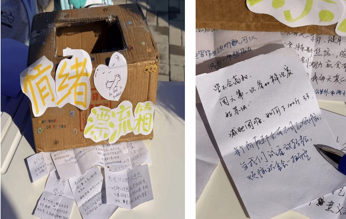 在“情绪漂流瓶”区域,同学们匿名写下烦恼投入箱中,或抽取他人纸条认真回复。一张张承载着心事与关怀的纸条,让这个秋日午后充满了温暖的对话。