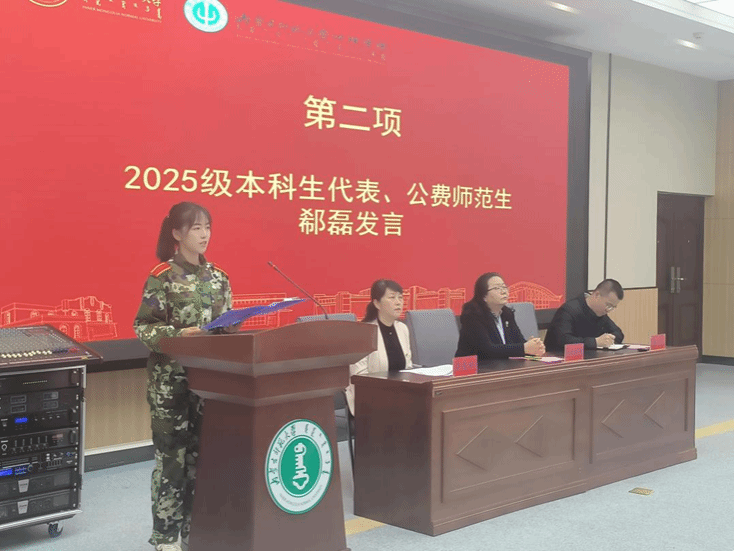 2025级心理学班郗磊作为本科生新生代表发言。她表达了对m88明昇的向往与期待,从个人与心理学结缘的经历出发,展现出新一代学子对学科的热爱以及对大员工活的憧憬。